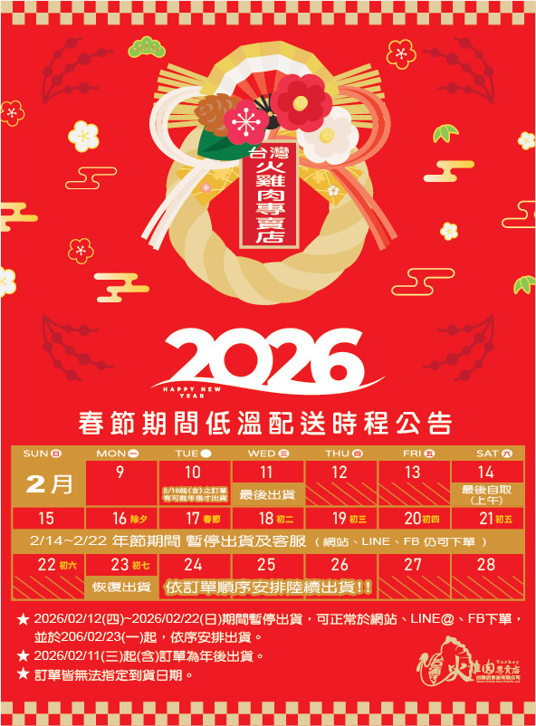 //春節期間低溫配送時程公告// *最後出貨日:2 月 11 日(三) *訂單皆無法指定到貨日期,請提再訂購,避免延誤。 *急件提醒:避免春節前物流量大造成延誤,急件請務必提早訂購 *春節休假期間:2 月 14 日(六)~2 月 22 日(日) *可正常於網站、LINE@、FB下單,並於206/02/23(一)起,依序安排出貨。 * 上班日:2 月 23 日(一)依訂單順序安排陸續出貨!! 感謝您的體諒與配合祝大家馬年順心、財源廣進、福氣滿滿